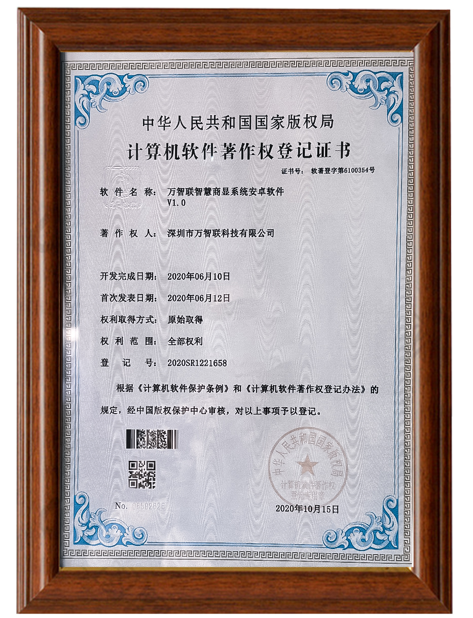 萬智聯(lián)智慧商顯系統(tǒng)安卓軟件著作權(quán)登記證書