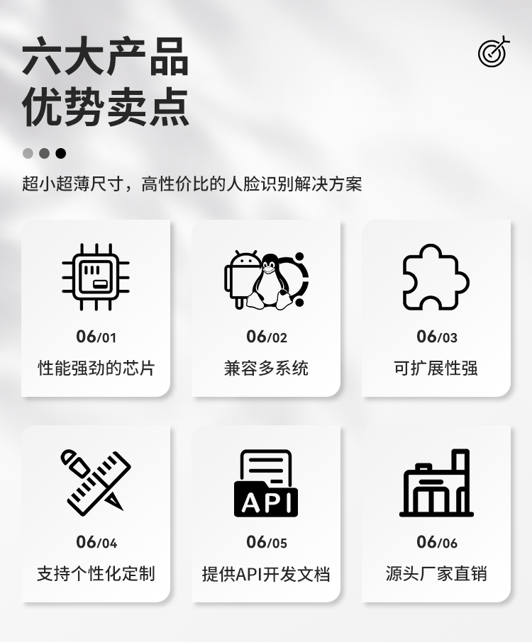 在處理器和芯片組上,根據(jù)客戶實際場景需求搭建具有優(yōu)質(zhì)人臉識別能力的功能模塊,充分發(fā)揮工業(yè)級別優(yōu)勢,打造具有高度穩(wěn)定性、低能耗度的產(chǎn)品方案。在外部接口搭建過程中,通過拓展網(wǎng)絡接口和外部接口、顯示接口,實現(xiàn)和實際應用場景的無縫對接。主要應用領(lǐng)域:動態(tài)人臉識別設備,考勤門禁機,手持核驗終端。