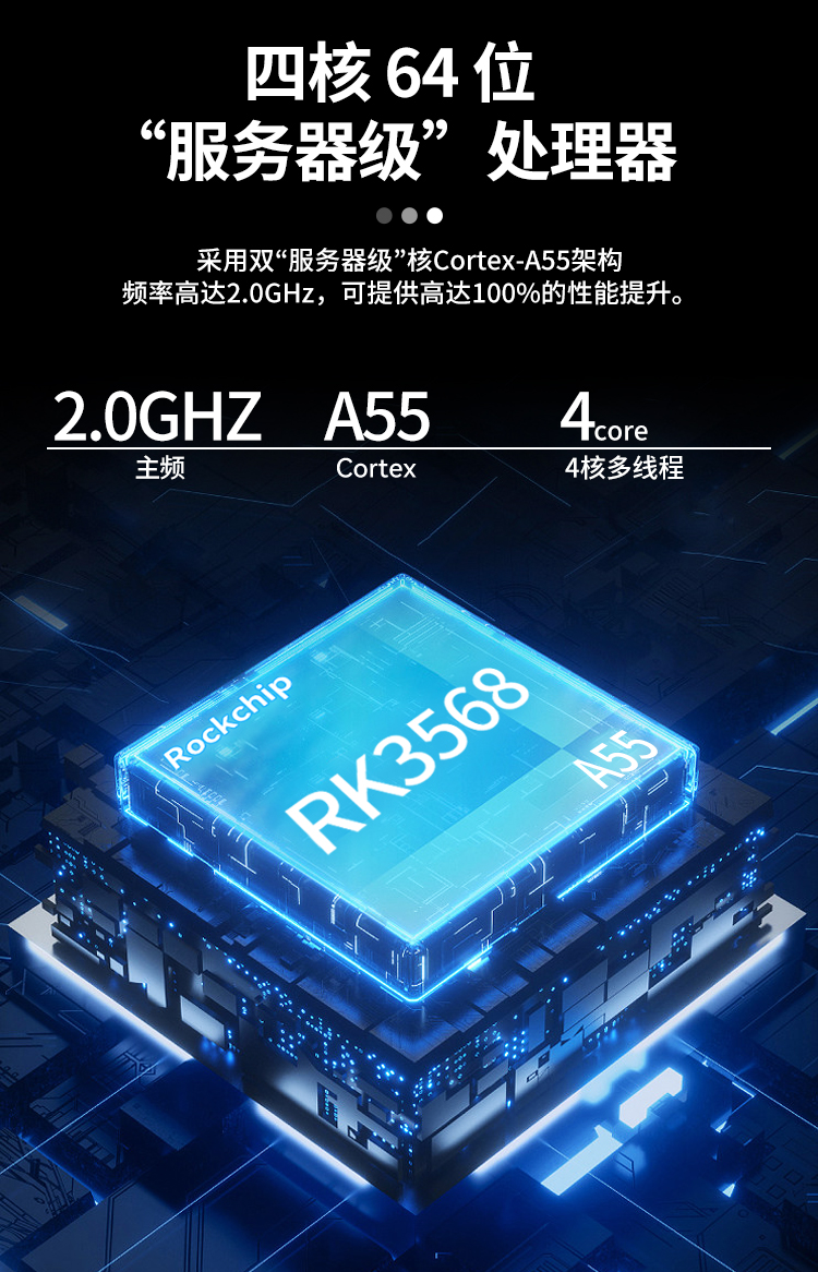 ◆ 四核低功耗 Cortex-A55 up to 2.0GHz,內(nèi)置 1TOPS NPU;