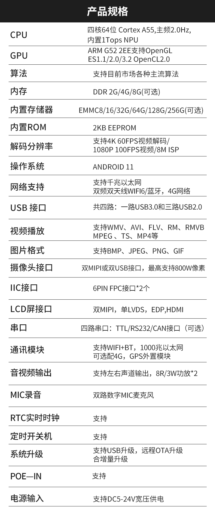 ◆ DDR 內(nèi)存 2G~8GB(可選),存儲(chǔ) EMMC 8G~256GB(可選);